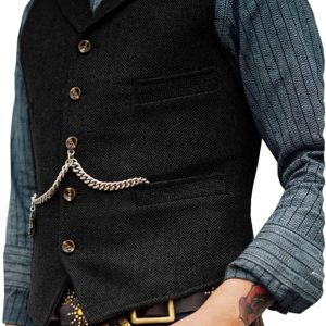 $50.00Features: Button closure, notch lapel neck, single breasted 5 buttons, 4 real side insert pockets, adjustable back strap. Size: Please read the our size chart information of the product in order to choose your own size,not Amazon size chart. Fabrics: Herringbone tweed pattern, it’s comfortable, simple, and classic.Wool blend vest for casual comfort. Occasions: The…